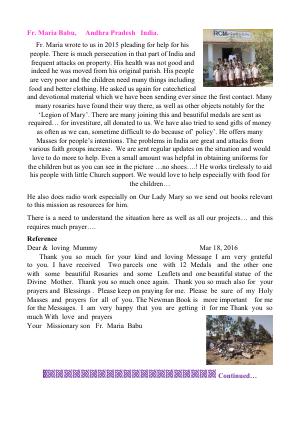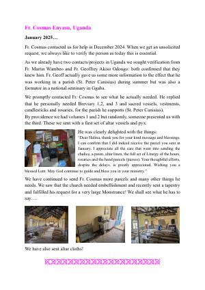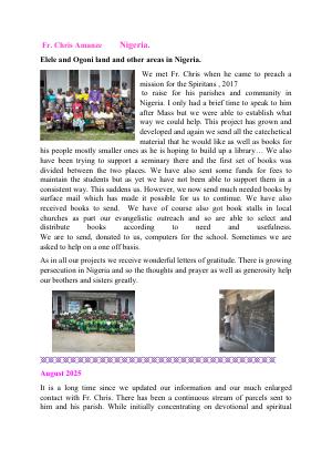 India. Kerala Daughters of Mary Uganda Fr Martin Wambeo and Fr, Geoff. Nigeria West Africa Fr. Chris Amanze East India. Fr. Maria Babu Nigeria. Imo State. Fr. Johnbosco Tanzania Fr. Aloyce Babene CP UGANDA Fr. Geoff Odongo Akiso Nigeria Delta State Fr. Nwabuifeukwu Anthony Chukwuemeka Madagascar Bishop Jean Claude. Rakotoarisoa Haiti Fr. Prosnel Altidor Uganda Fr. Cosmas Ensayasu Occasional Support (one-off) Sister Sussan Opara. Sisters of the Compassionate Heart of Christ
